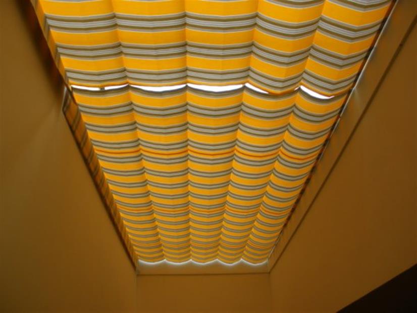 Con sus tres opciones de instalacion: a pared, glorieta y entre paredes, el toldo romano es un toldo plano confeccionado con argollas en sus ondas e instalado con alambres o cables tensados. Se pliega mediante cuerdas con roldanas. Es un toldo que generalmente se instala en patios interiores y exteriores, claraboyas y para cubrir areas medianas, grandes y/o irregulares.